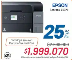 | Impresora Multifuncional EPSON Ecotank L6370 WiFi Hg-Of - Negro | Alkomprar | $ 2.699.000,00 | $ 1.999.070,00 | $ 699.930,00 Descuento | 04 diciembre 2025 | 22 enero 2026 | |