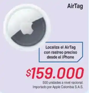 El AirTag ahora está disponible con descuento en Alkosto. En esta página encontrarás toda la información sobre los precios actuales, las condiciones de la promoción y la duración de la oferta. No olvides revisar también las ofertas y promociones comparables de AirTag, para que siempre hagas la elección más económica.La promoción de descuento para AirTag es válida desde 31-01-2026 hasta 01-03-2026. ¿La promoción ha terminado? No hay problema, siempre puedes ver otras ofertas similares. También puedes seguir la categoría del producto para estar informado tan pronto como AirTag vuelva a estar en oferta en Alkosto. Comparando las ofertas de AirTag, siempre puedes asegurarte de hacer tus compras al menor precio posible. Así que sigue revisando nuestro sitio para ver si AirTag pronto será ofrecido nuevamente con un atractivo descuento.