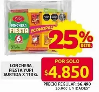| Lonchera fiesta yupi surtida 119 g | Ara | $ 4.990,00 | -15% | 18 diciembre 2024 | 01 enero 2025 | ||