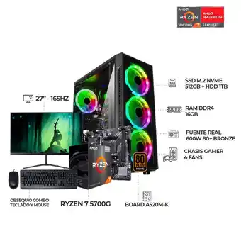 Oferta de PC GAMER R7 5700G - BOARD A520M-K - 16GB RAM - 512GB SSD + 1TBHDDMONITOR27" en Falabella