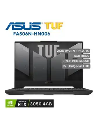 ¡Consulta el producto más barato entre todas las ofertas! Si deseas saber si Falabella tiene el descuento más alto para Portátil TUF FA506N AMD Ryzen 5 7535HS, 512GB PCIE G4 SSD, 8GB DDR5, 15.6 FHD, RTX 3050 4GB, compáralo en la página temática o con otras tiendas.